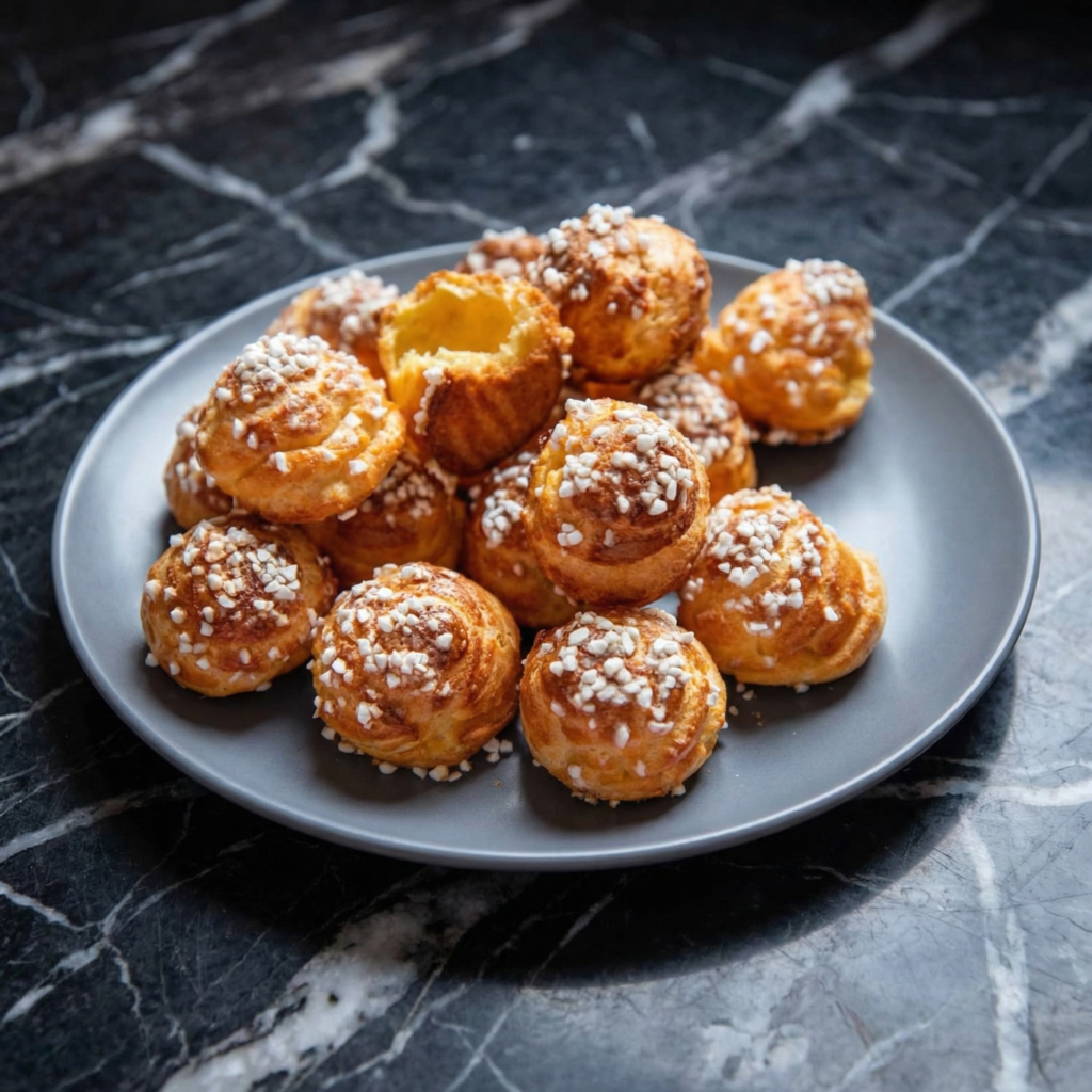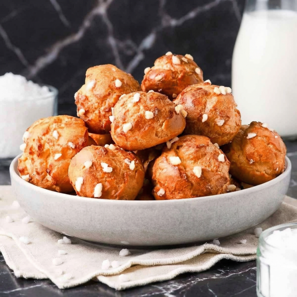 Chouquettes are the delightful little bites found in every French bakery—light, airy puffs of choux pastry topped with crunchy pearl sugar. They’re simpler than filled éclairs or cream puffs, but just as delicious. The contrast between the soft, hollow pastry and the sweet, crunchy sugar topping is absolutely irresistible.
